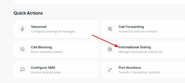 International calling is managed directly in the portal under Quick Actions > International Dialing. Enable the toggle, save your changes, and use your voicemail PIN when prompted to place international calls.
