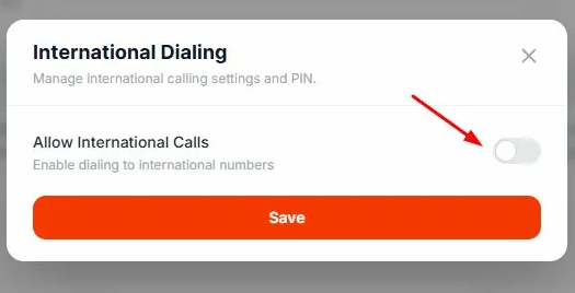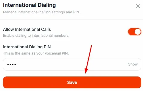 - When international dialing is enabled, a International Dialing PIN field will appear below the toggle.