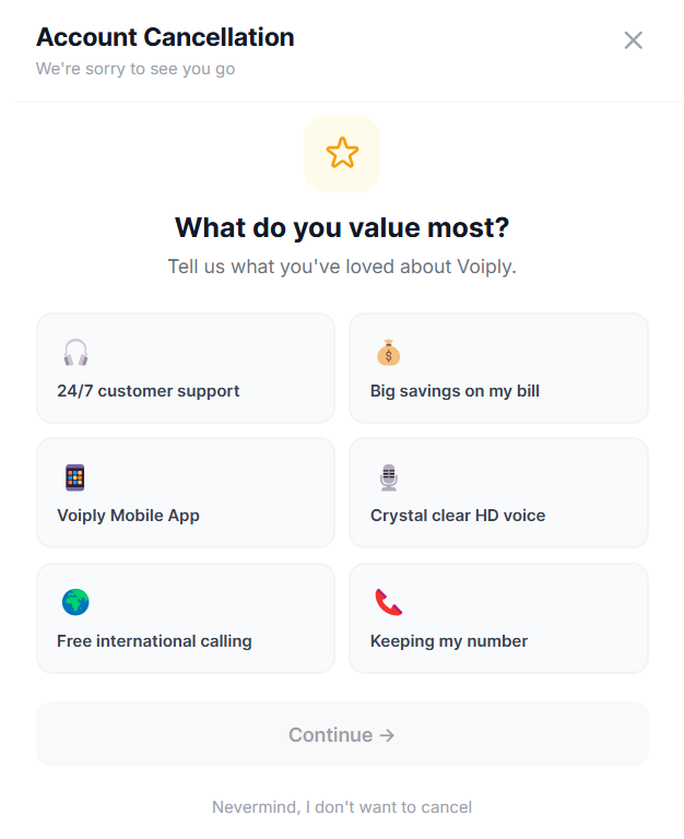 Select the feature or benefit that meant the most to you during your time with Voiply. Your options are: