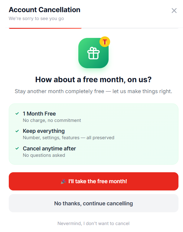 Free Month Offer — We may offer you one month completely free — no charge, no commitment. Your number, settings, and features will all stay in place, and you can cancel anytime after with no questions asked.