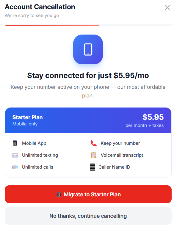 To accept, click Migrate to Starter Plan. To keep cancelling, click No thanks, continue cancelling.