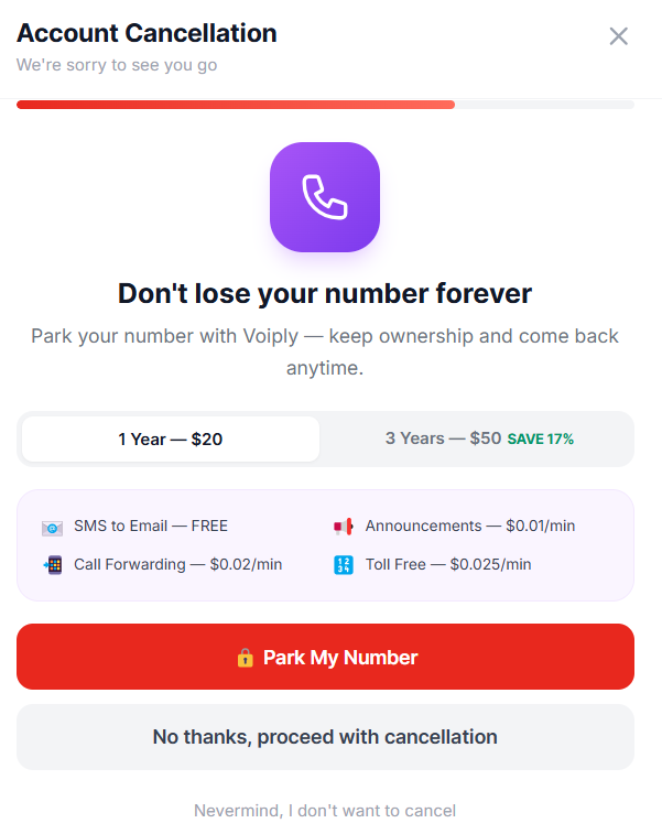 You'll have the option to park your phone number with Voiply. This lets you keep ownership of your number and come back anytime.