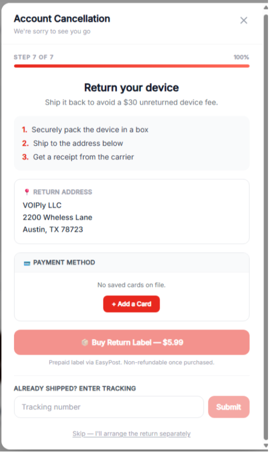 Return Address (US only): VOIPly LLC, 2200 Wheless Lane, Austin, TX 78723