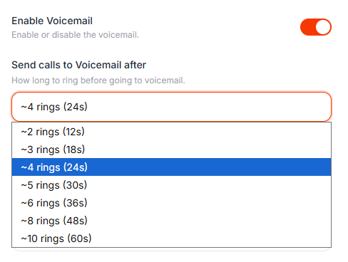 Open the dropdown next to Send calls to Voicemail after and choose between 2 to 10 rings.