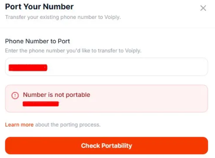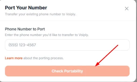 In the Port Your Number window, type in the phone number you want to transfer to Voiply, then click Check Portability.