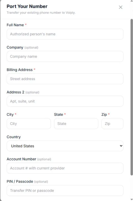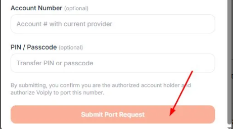 By submitting, you confirm that you are the authorized account holder and that you authorize Voiply to port the number on your behalf.