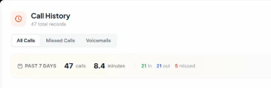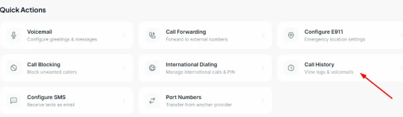 Option A – Quick Actions Card From your Dashboard, scroll to the Quick Actions section and click the Call History card (View logs & voicemails).