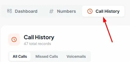 Option B – Call History Tab At the top of any page in the portal, click the Call History tab in the navigation bar (next to Dashboard and Numbers).