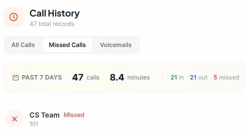 | Missed Calls | Calls that were not answered (shown with a red X and labeled Missed) |