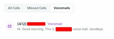 Click the Voicemails tab to see any voicemail messages. Each voicemail entry displays: