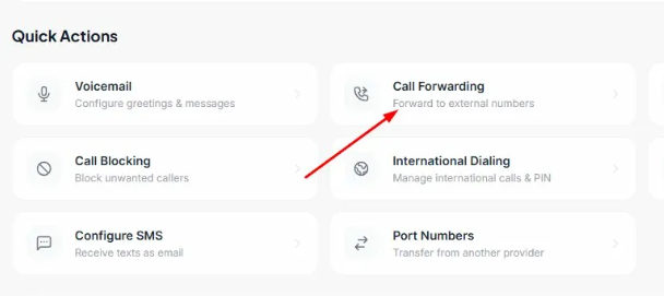 Step 2: Go to Call Forwarding From the dashboard, find the Quick Actions section. Click on Call Forwarding.