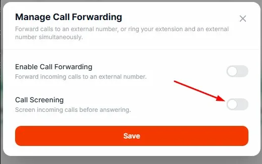 Step 4: Turn on Call Screening Click the toggle next to Call Screening to turn it on. The toggle will turn orange when it is active.
