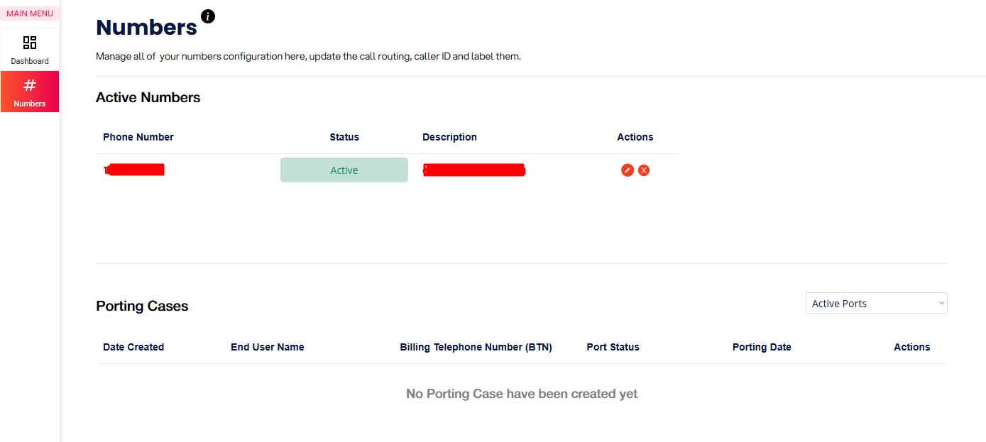 The Numbers tab in your Voiply Residential Portal is where you manage everything related to your phone numbers. This includes viewing your active number, checking its status, adding a description, and tracking any number porting activity. If you ever need to confirm whether your number is active or check the status of a port request, this is the place to look.