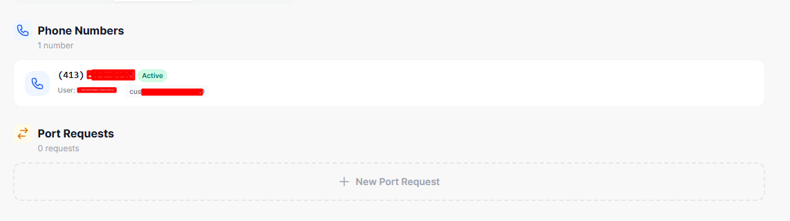 If no port requests have been submitted yet, you'll see a + New Port Request button. Click it to begin the number transfer process.