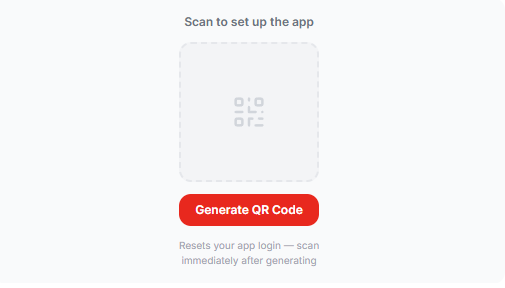 - Your QR code will appear on screen. Scan it right away. Generating a new QR code resets your app login, so do not close or refresh the page before scanning.