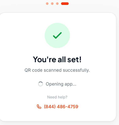- Once the code is scanned, you will see a "You're all set!" confirmation screen. The app will open automatically.