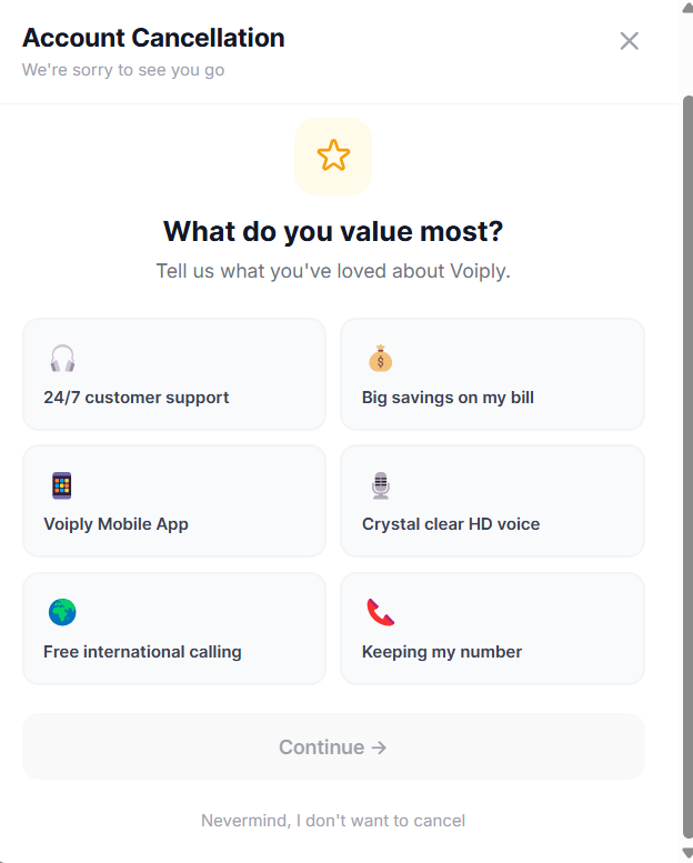Select the feature or benefit that meant the most to you during your time with Voiply. Your options are: