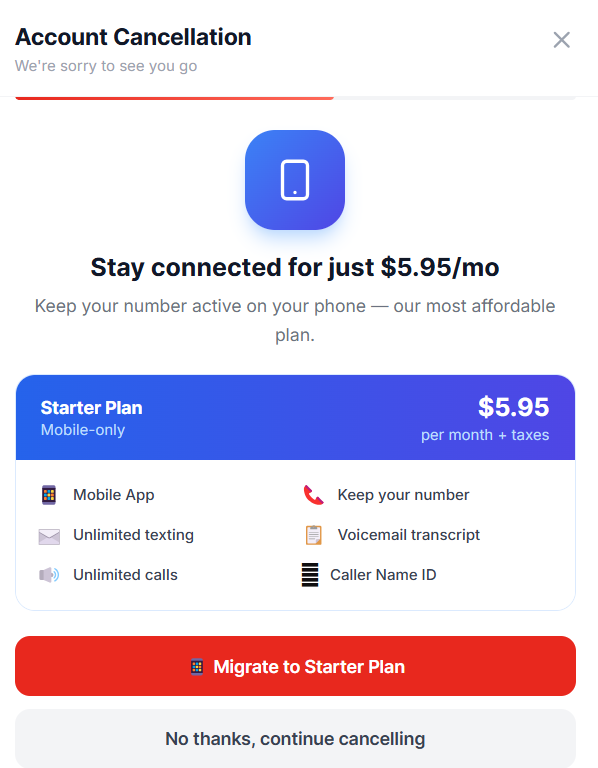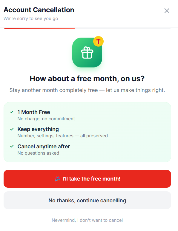 Free Month Offer We may offer you one month completely free — no charge, no commitment. Your number, settings, and features will all stay in place, and you can cancel anytime after with no questions asked.
