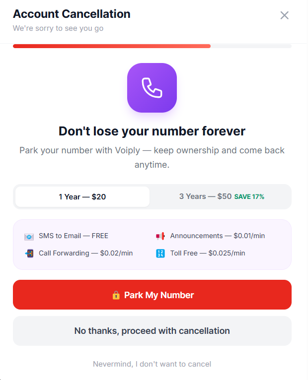 At Step 5 of 7, you'll have the option to park your phone number with Voiply. This lets you keep ownership of your number and come back anytime.