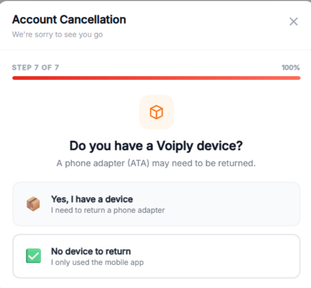 If you have a device (ATA/phone adapter): Select Yes, I have a device — I need to return a phone adapter.