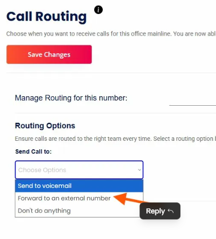 3. Select Your Routing Option Under the Routing Options section, locate the Send Call to dropdown and click on it. You will see the following options: